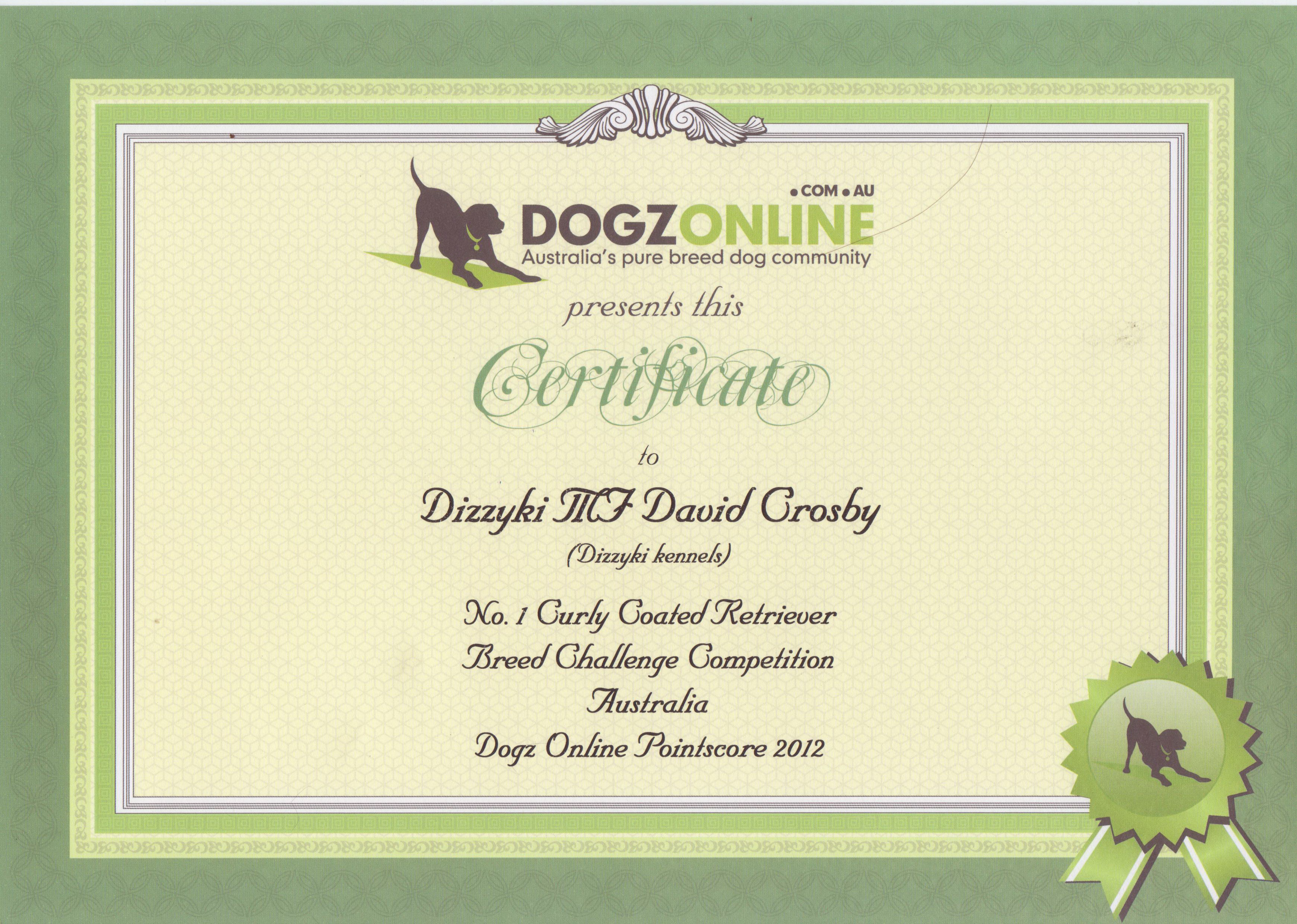 DogzOnLine Certificate: Crosby, #1 Curly Coated Retriever – Australia, 2012